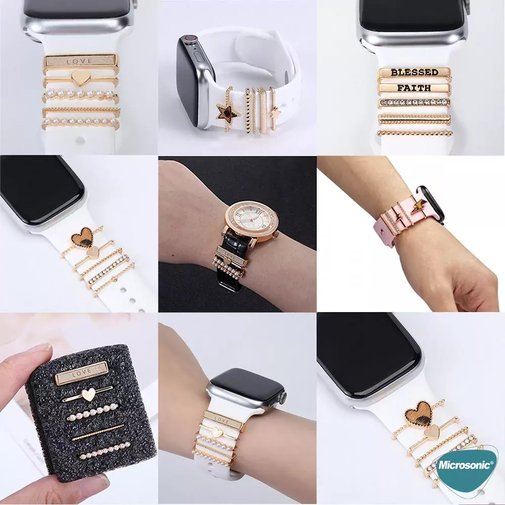 Microsonic Apple Watch SE 3 44mm Kordon Süsü Charm İnci Kalp Gümüş