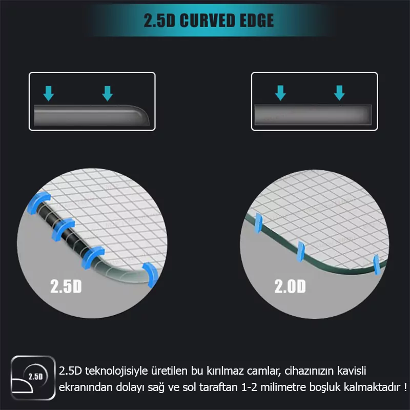 ✅ 2.5D teknolojisiyle üretilen bu kırılmaz camlar, cihazınızın kavisli ekranından dolayı sağ ve sol taraftan 1-2 milimetre boşluk kalmaktadır !